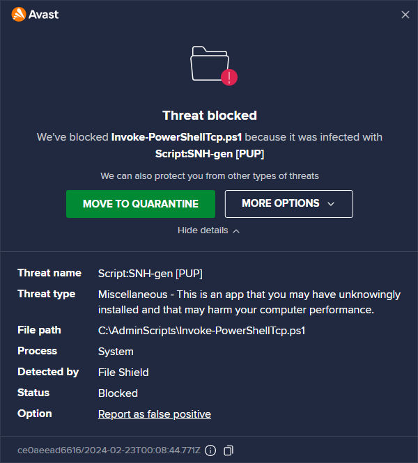 Avast was likely able to detect a threat here because Invoke-PowerShellTcp.ps1 is a seven year-old reverse shell script with around 8,000 stars on Github. Although this script isn’t necessarily malware, it definitely isn’t a script an administrator would commonly use. Thus, it is classified as a PUP (Potentially Unwanted Program) and blocked.