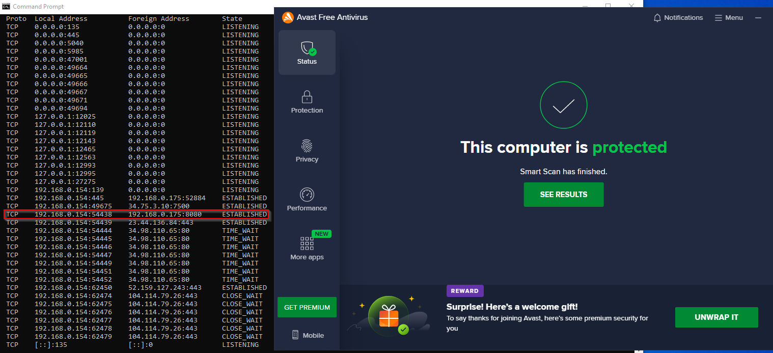 Furthermore, I confirmed the connection was active in command prompt with netstat and Avast wasn’t showing any alerts. I would assume this is because an outgoing connection via PowerShell isn’t inherently malicious. If anything, this demonstration shows the downfalls of signature-based detections.