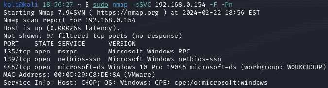 This lab environment consists of a Windows 10 Pro system and an Attack Host (Kali Linux) on the same private network. Initially, I started an Nmap scan to enumerate the host.