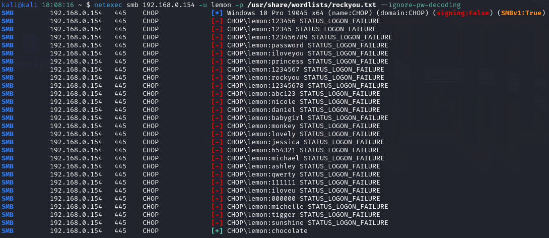 The earlier screenshot had a comment from “lemon” - so let’s try to brute-force credentials for username “lemon”. The Netexec tool