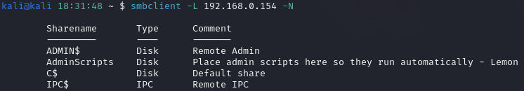 As seen in the screenshot above, SMB (Port 445) is running. To enumerate SMB, I used smbclient, a command line tool that facilitates connections to SMB servers, to successfully authenticate with the ‘-N’ flag.