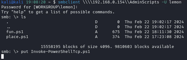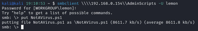 Let’s test. I uploaded the script via smbclient using lemon’s credentials as we did before.