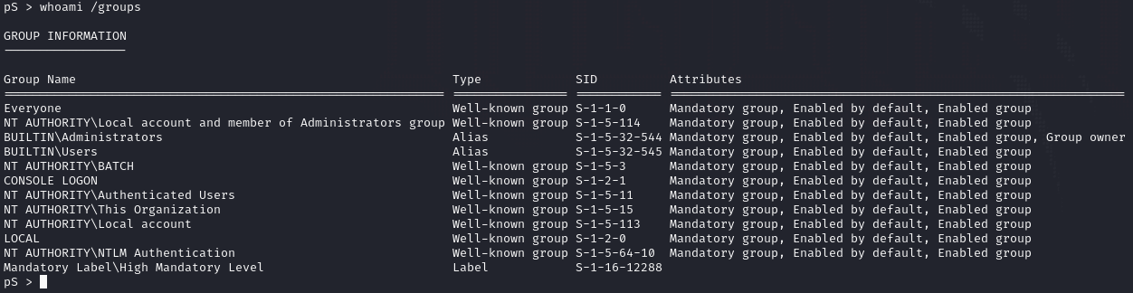 To test command execution, I issued whoami /groups which reveals the current user is an administrator.